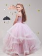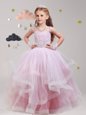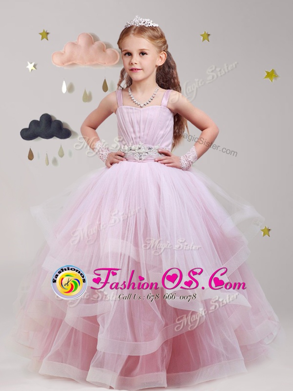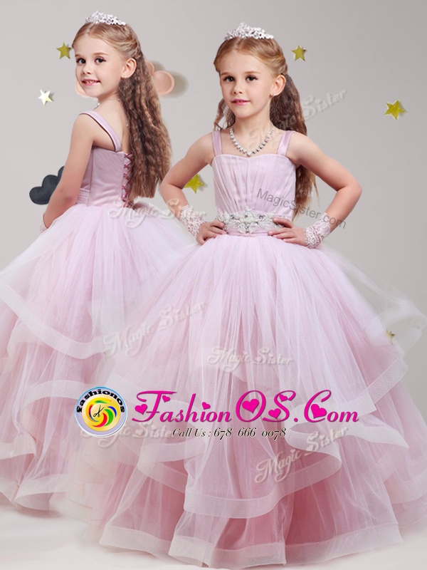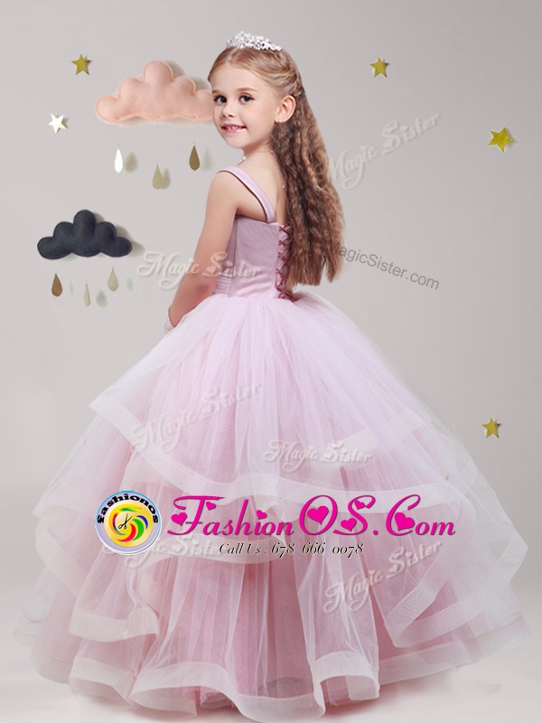 Glamorous Baby Pink Flower Girl Dress Party and Quinceanera and Wedding Party and For with Beading and Ruffles Straps Sleeveless Lace Up