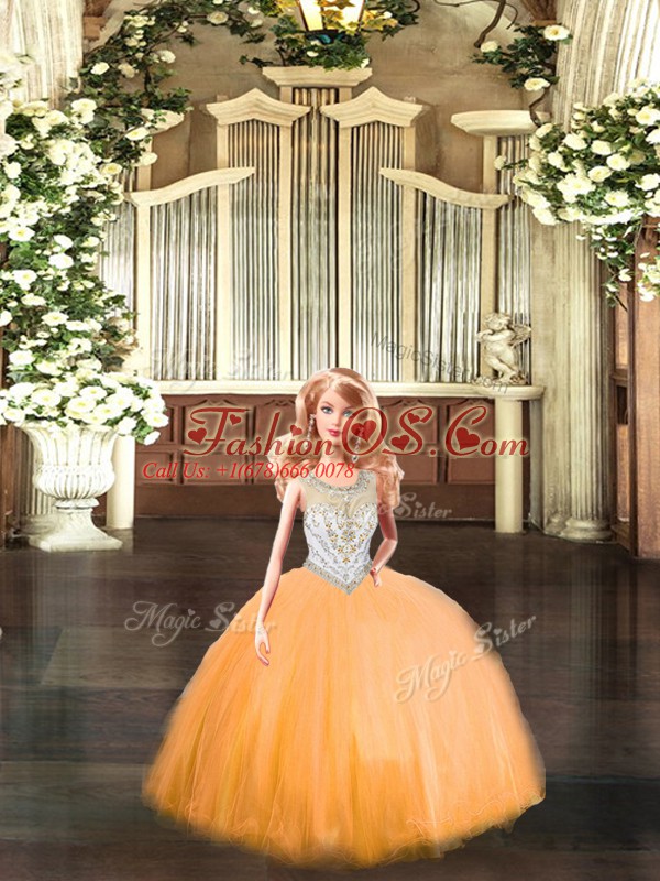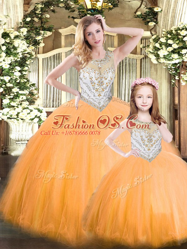 Glamorous Orange Red Ball Gowns Scoop Sleeveless Tulle Floor Length Lace Up Beading Vestidos de Quinceanera