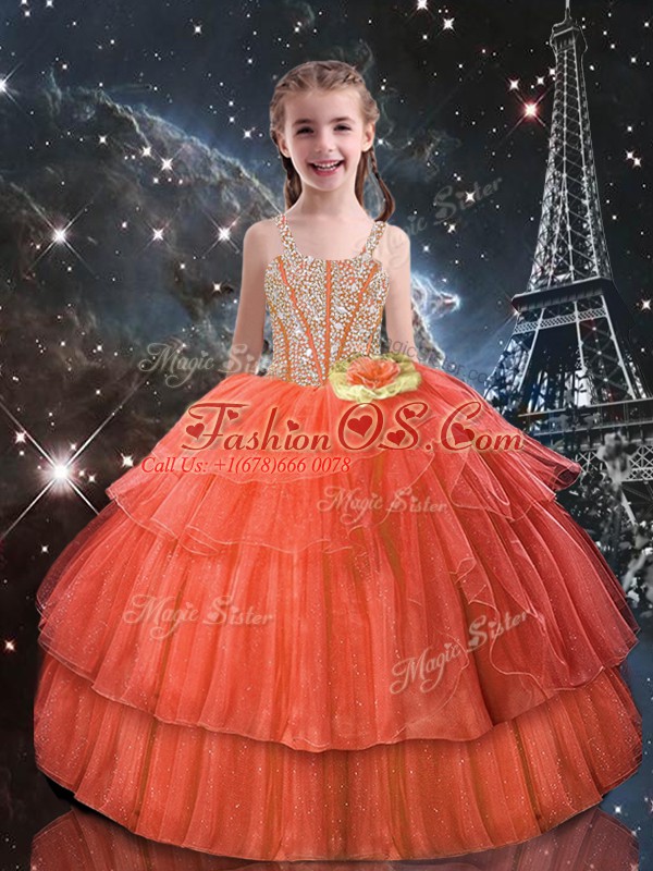 Home >  Special Occasion Dresses >  Mini Quinceanera Dresses > Glamorous Orange Red Lace Up Custom Made Pageant Dress Beading and Ruffled Layers Short Sleeves Floor Length