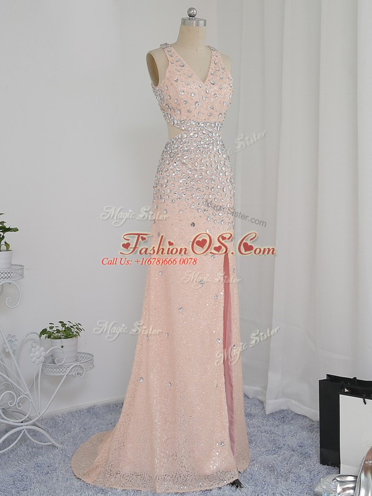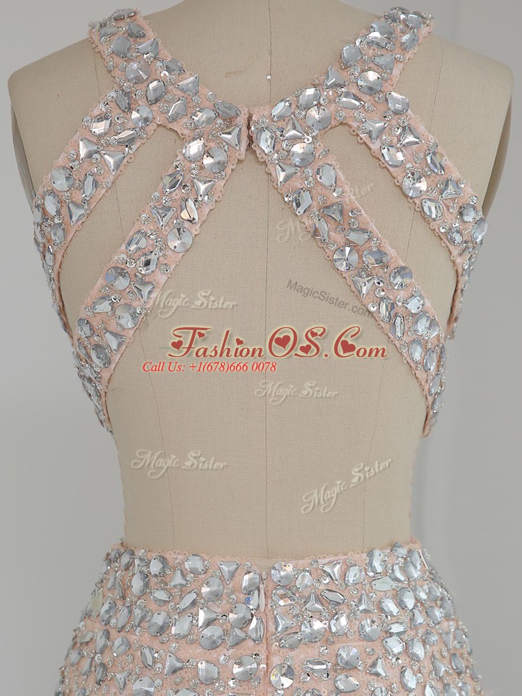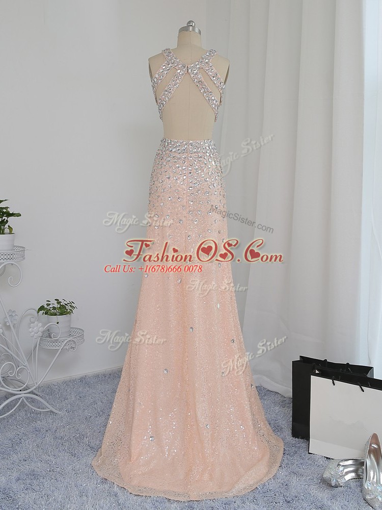 Home >  Prom Dresses >  Fashionable Prom Dresses > Glamorous Peach Column/Sheath Beading Prom Dresses Backless Chiffon Sleeveless Floor Length