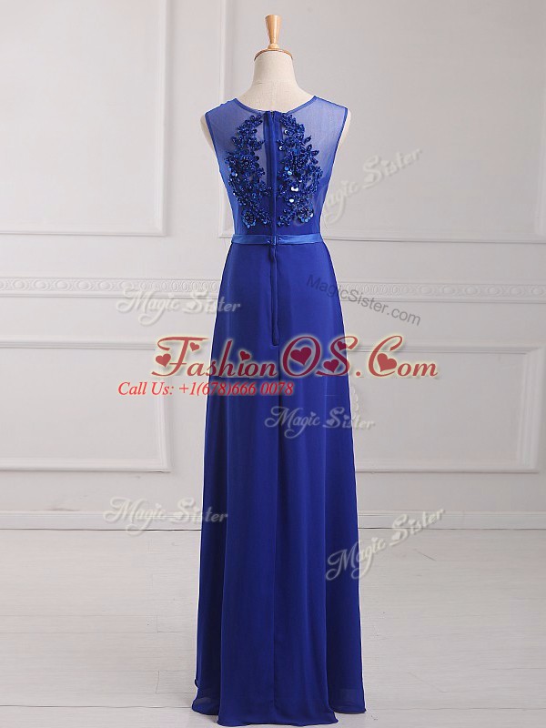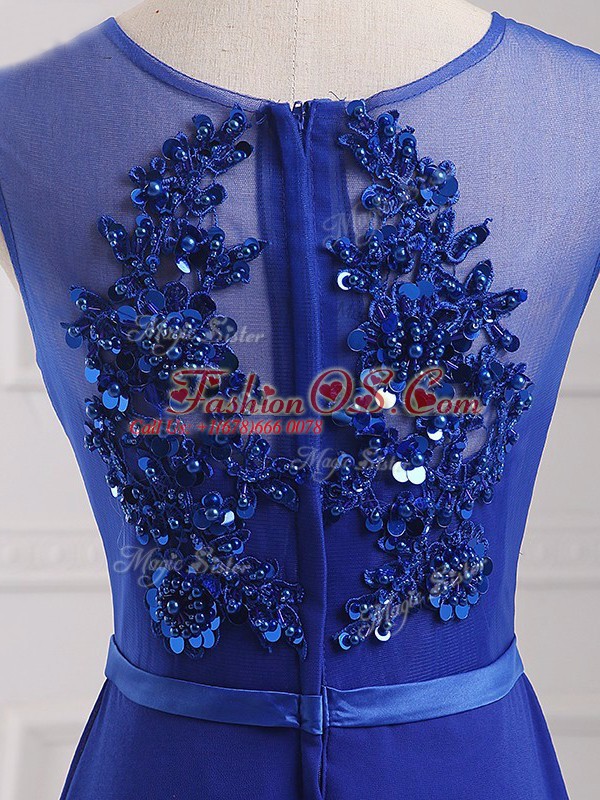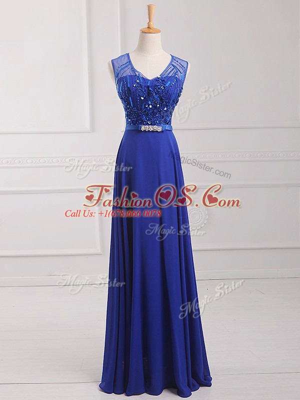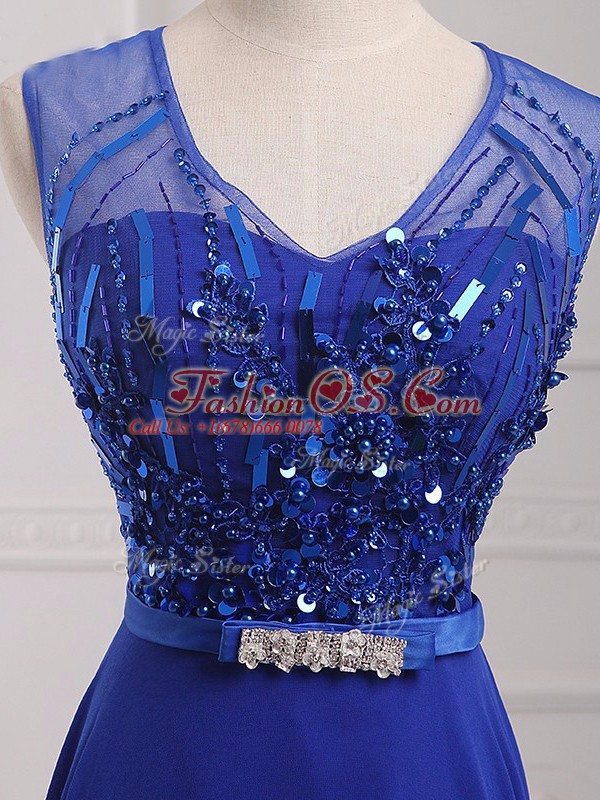 Glamorous Sleeveless Chiffon Floor Length Zipper Homecoming Dress in Royal Blue with Beading and Belt