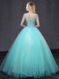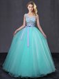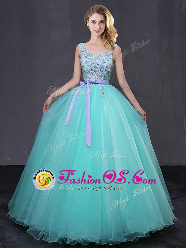 Glittering Aqua Blue Scoop Lace Up Appliques and Belt Quinceanera Dresses Sleeveless