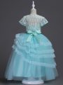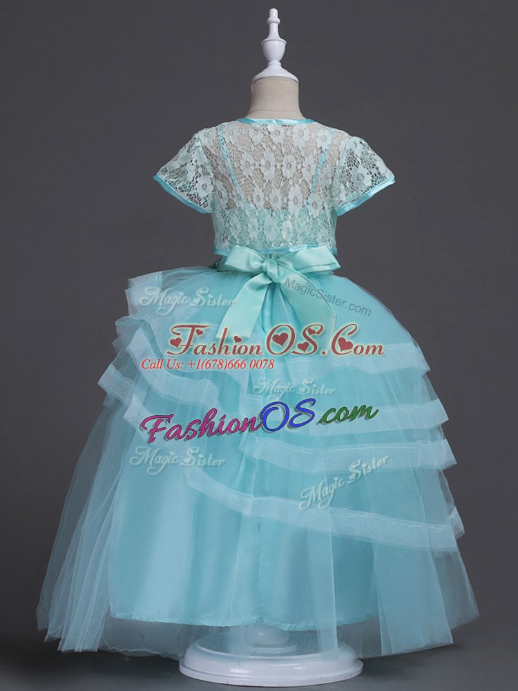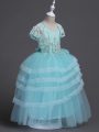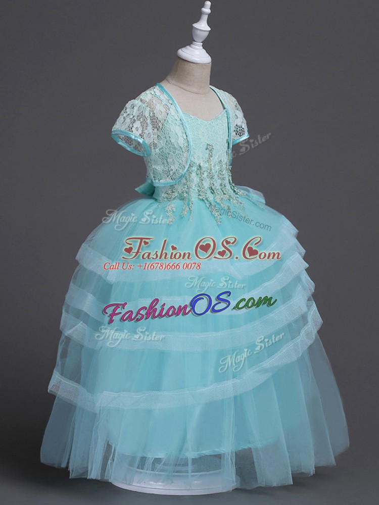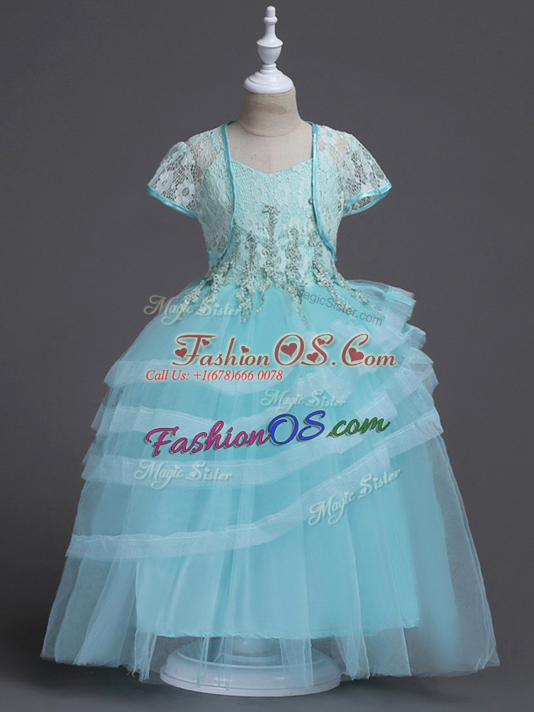 Glittering Floor Length Aqua Blue Flower Girl Dresses for Less Tulle Sleeveless Appliques