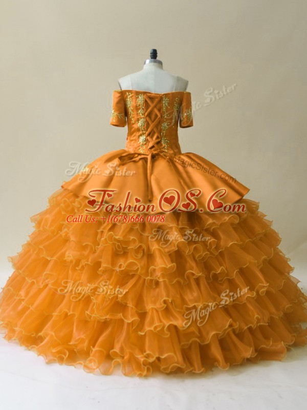Glittering Gold Vestidos de Quinceanera Sweet 16 and Quinceanera with Embroidery and Ruffled Layers Off The Shoulder Sleeveless Lace Up