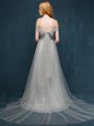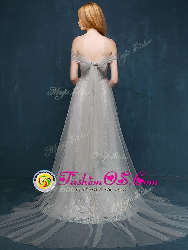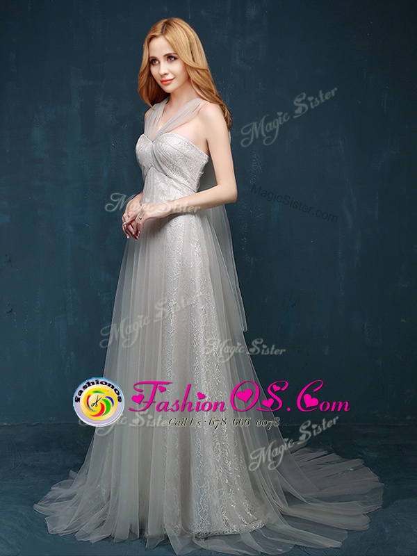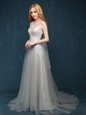 Glittering Lace Grey One Shoulder Zipper Ruching and Bowknot Prom Dress Brush Train Sleeveless