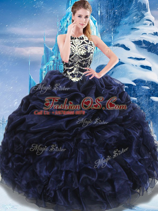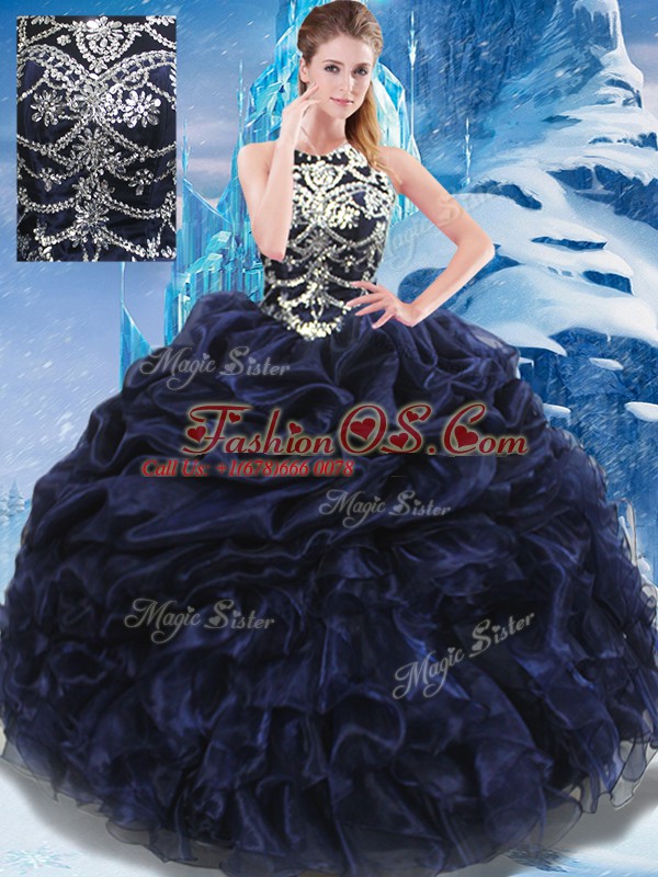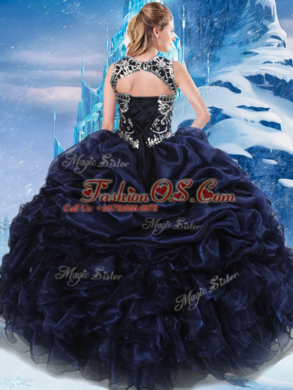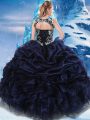 Glittering Navy Blue Sleeveless Floor Length Appliques and Ruffles and Pick Ups Lace Up Sweet 16 Dresses