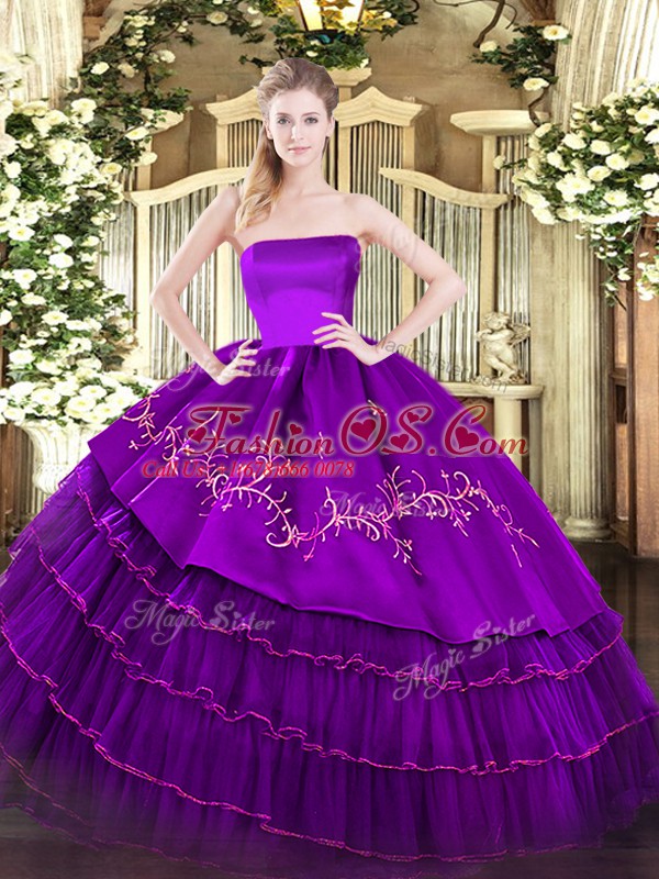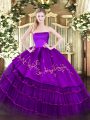 Glittering Purple Strapless Neckline Embroidery and Ruffled Layers Sweet 16 Dress Sleeveless Zipper