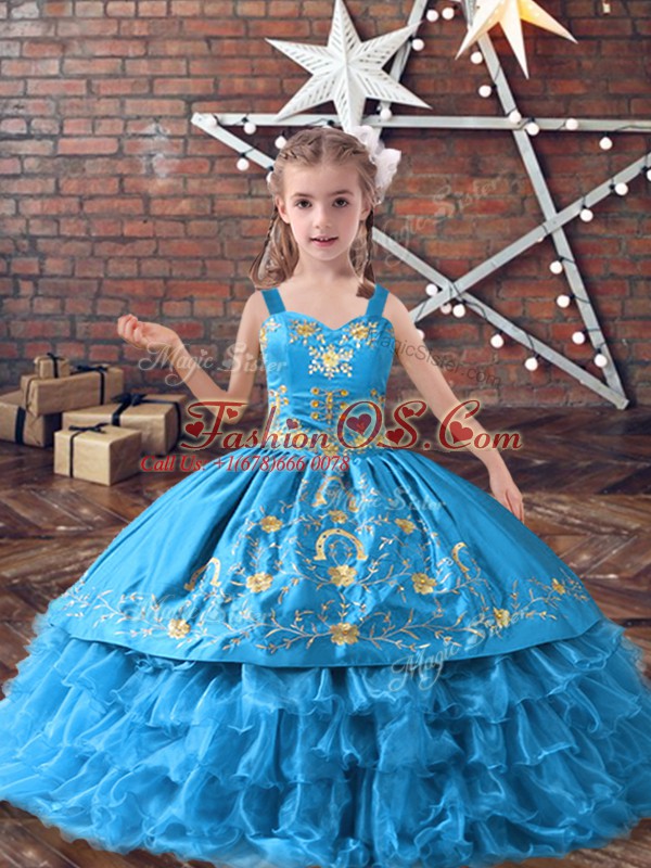 Home >  Special Occasion Dresses >  Lovely Little Girl Pageant Dresses > Glorious Baby Blue Satin and Organza Lace Up Kids Pageant Dress Sleeveless Floor Length Embroidery and Ruffled Layers