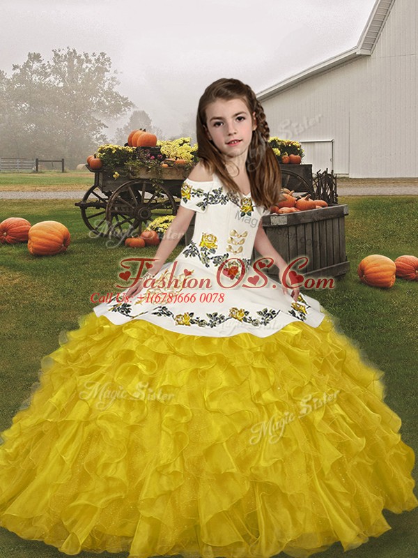 Glorious Gold Sleeveless Embroidery and Ruffles Floor Length Pageant Gowns For Girls