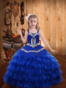 Glorious Royal Blue Lace Up Straps Embroidery and Ruffled Layers Little Girls Pageant Gowns Chiffon Sleeveless