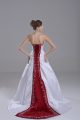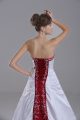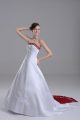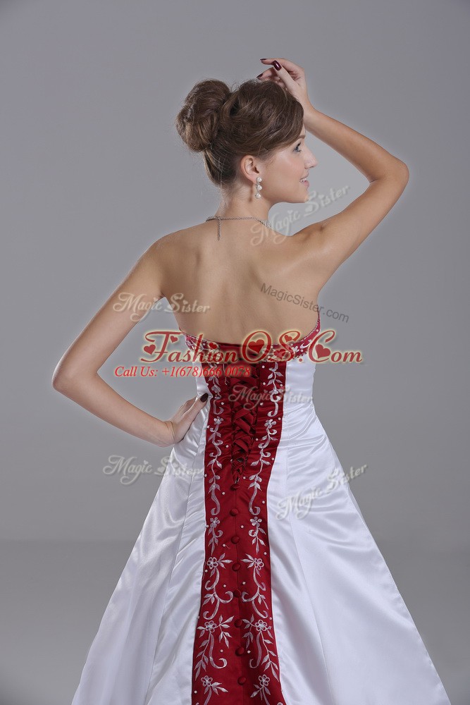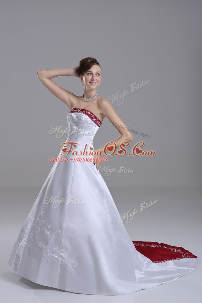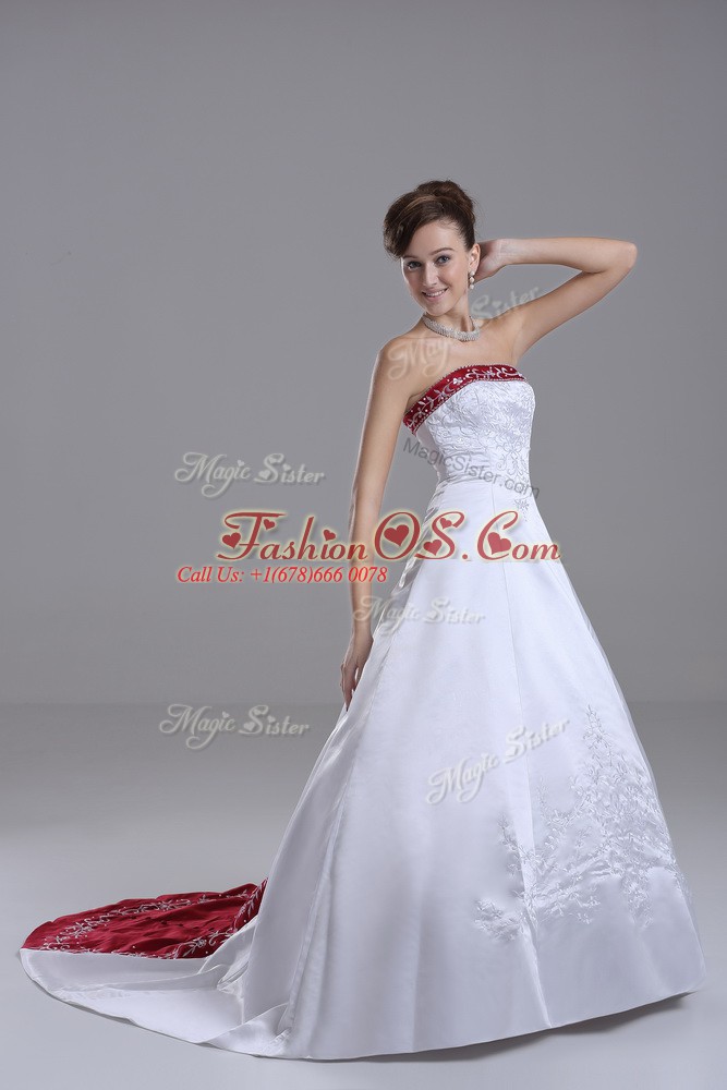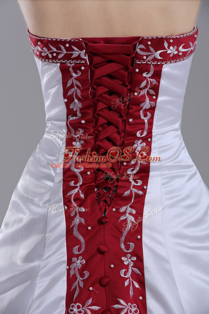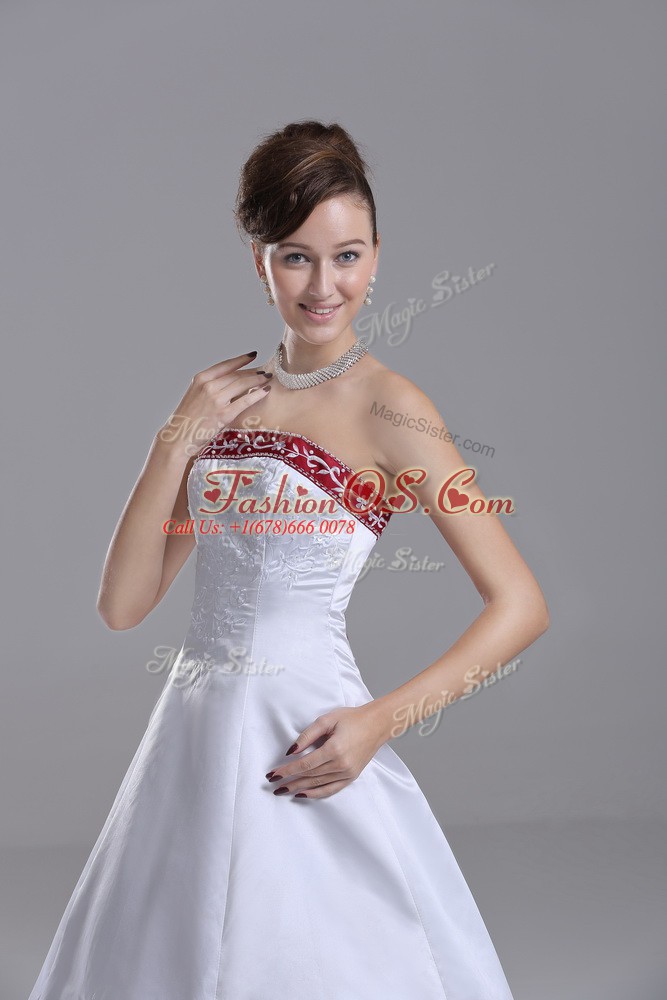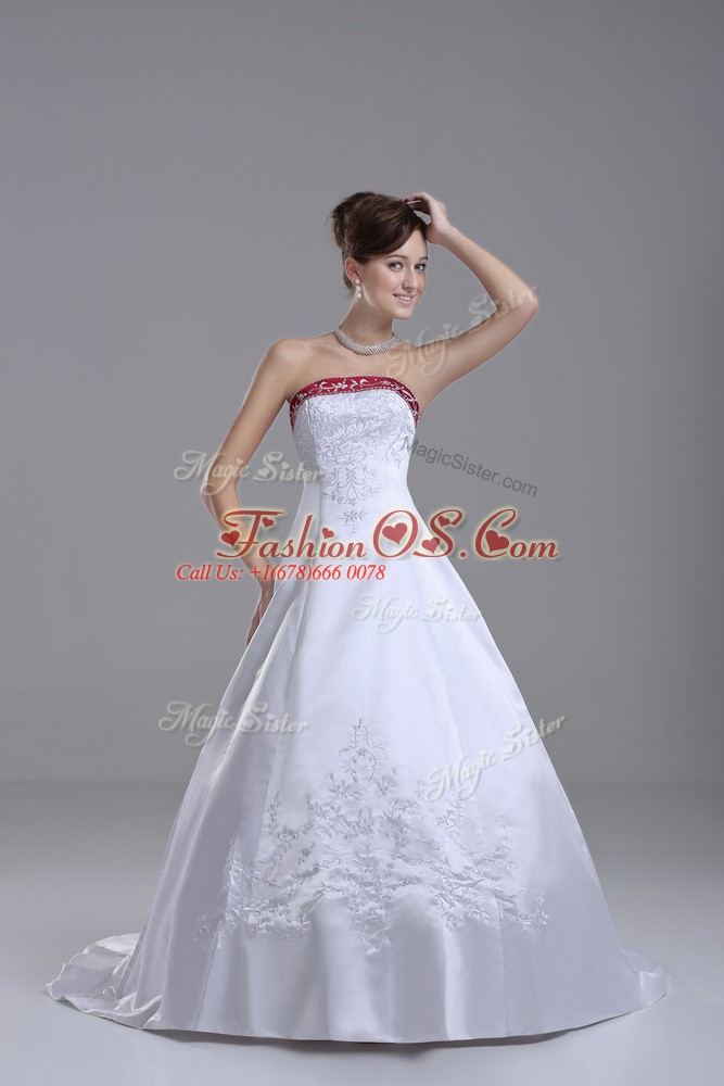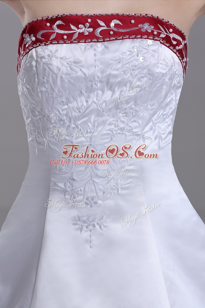 Glorious White Satin Lace Up Strapless Sleeveless Wedding Dress Brush Train Beading and Embroidery