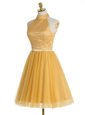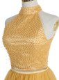 Gold A-line Organza High-neck Sleeveless Beading Mini Length Zipper Dress for Prom