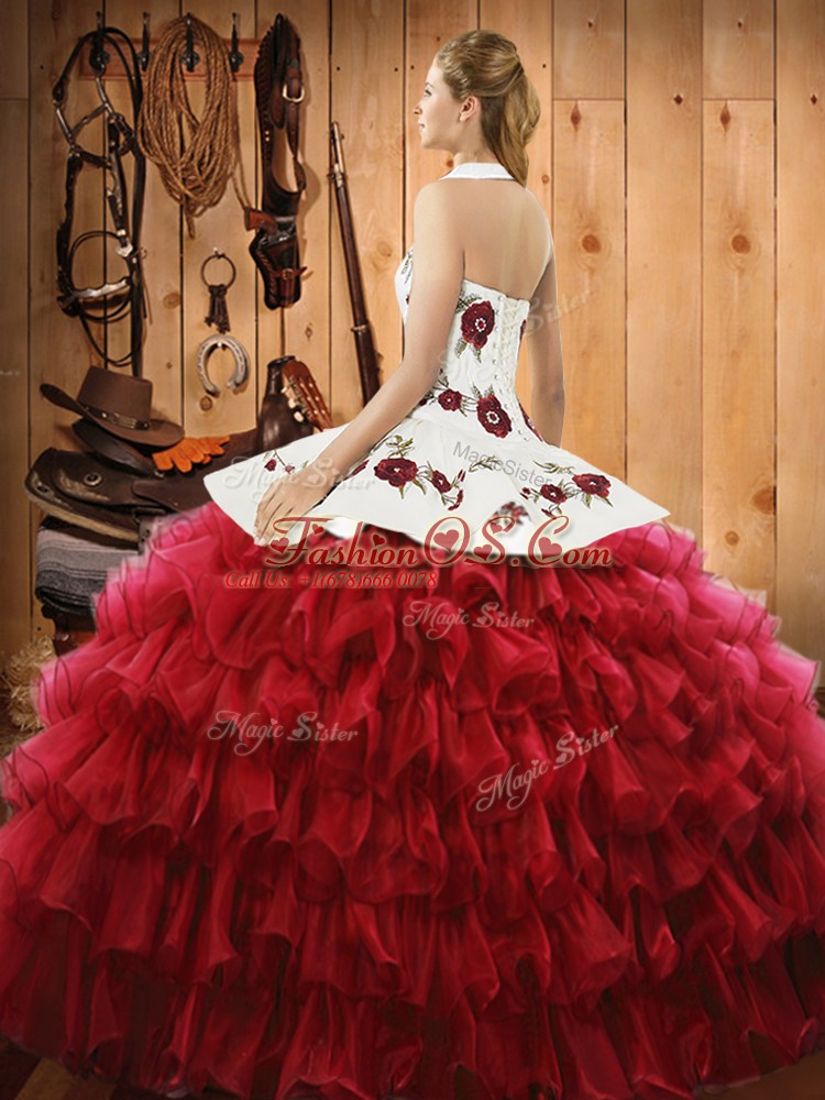 Gold Ball Gowns Halter Top Sleeveless Satin and Organza Floor Length Lace Up Embroidery and Ruffled Layers Sweet 16 Dress