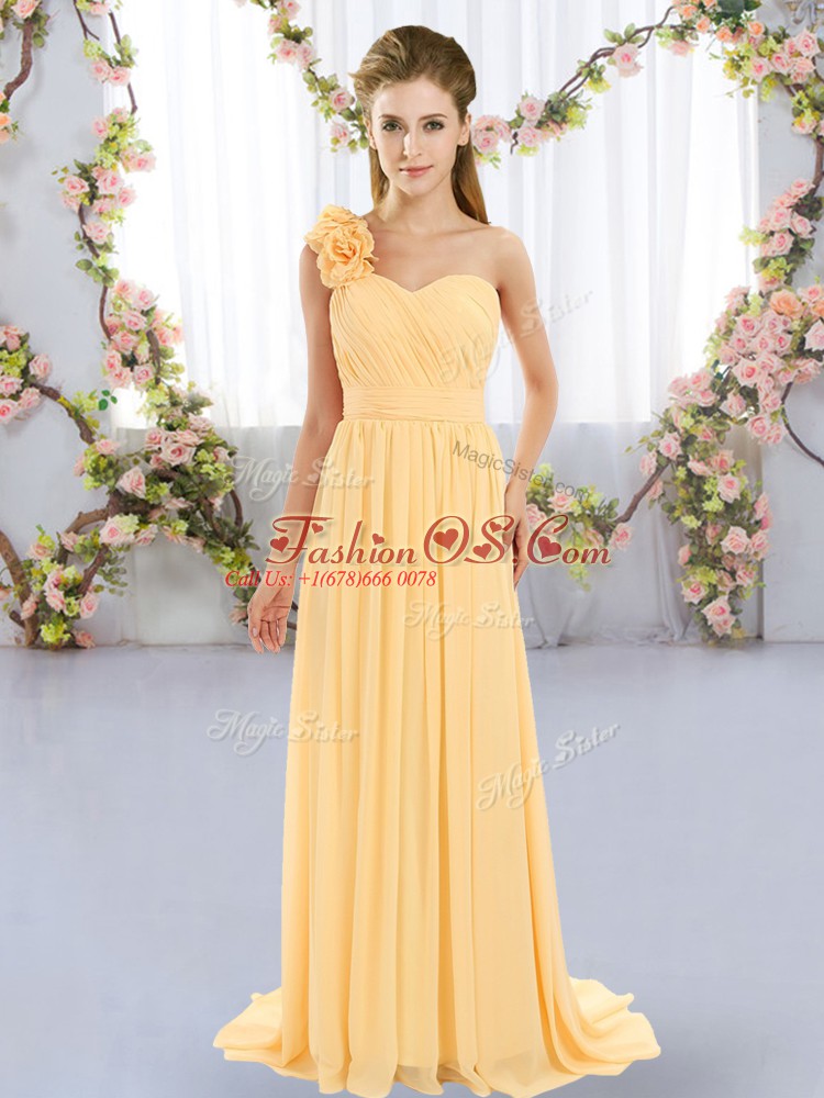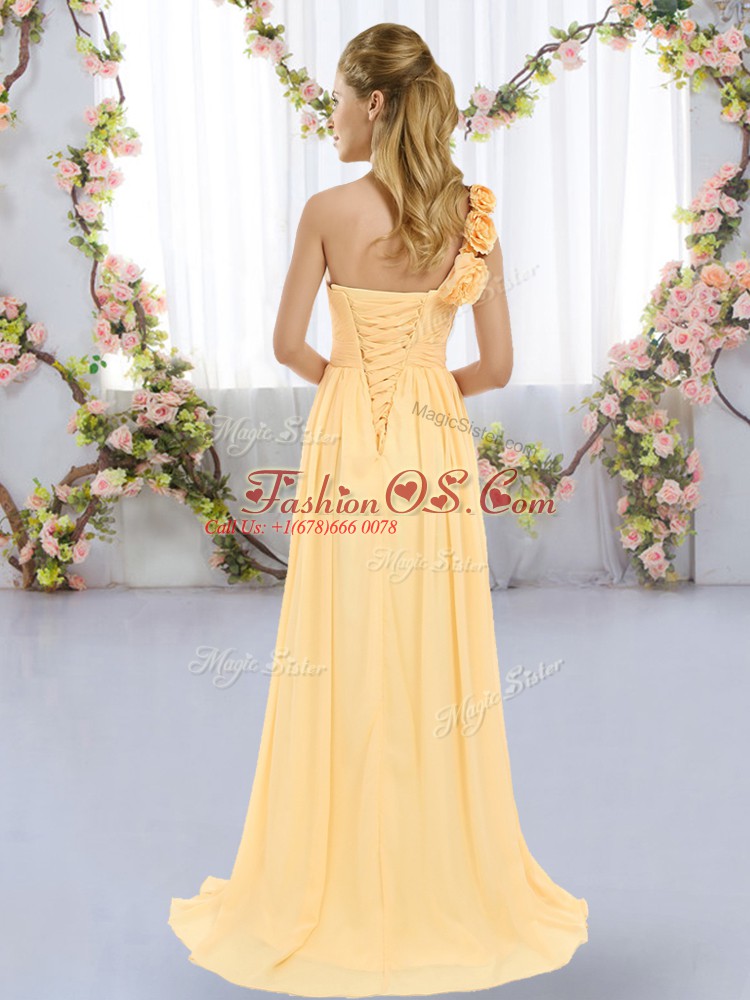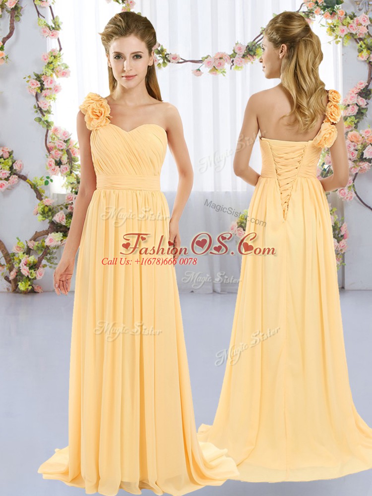 Gold Lace Up Quinceanera Court of Honor Dress Hand Made Flower Sleeveless Brush Train
