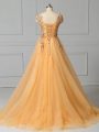 Gold Lace Up Scoop Appliques and Pattern Prom Dresses Tulle Sleeveless Brush Train