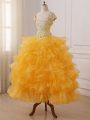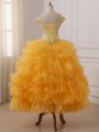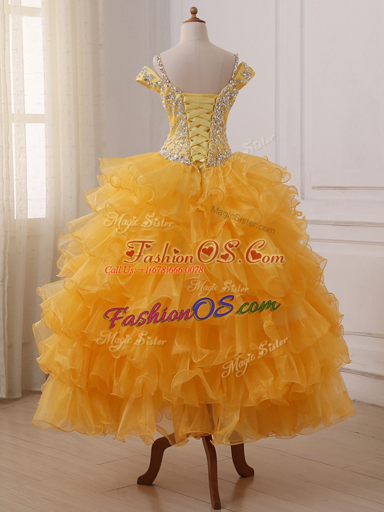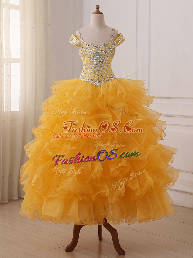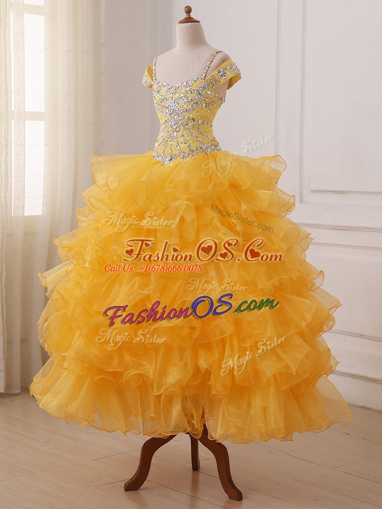 Gold Organza Lace Up Off The Shoulder Sleeveless Floor Length Kids Pageant Dress Beading and Ruffled Layers