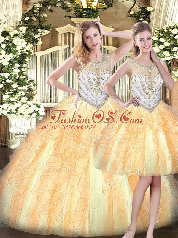 Gold Scoop Neckline Beading and Ruffles Quinceanera Gowns Sleeveless Zipper