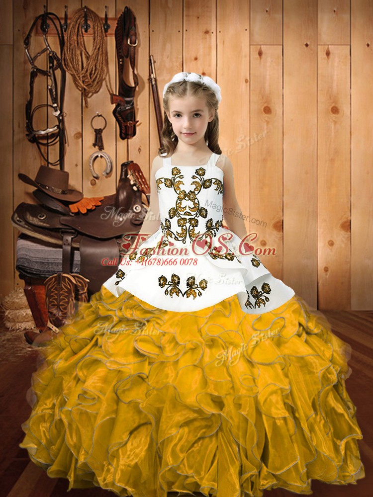 Gold Sleeveless Floor Length Embroidery and Ruffles Lace Up Little Girl Pageant Gowns