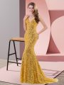 Gold Sleeveless Sequined Sweep Train Lace Up Dress for Prom for Prom and Party and Military Ball