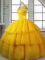 Gold Straps Lace Up Ruffled Layers Ball Gown Prom Dress Sleeveless