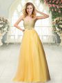 Home >  Prom Dresses >  Elegant Prom Dresses > Gold Tulle Zipper Sleeveless Floor Length Beading