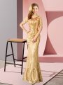 Gold Zipper Prom Dresses Sequins Half Sleeves Floor Length