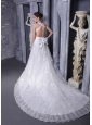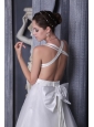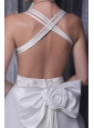 This elegent wedding dress features straps neckline accented with beading in the bust, the crossed straps in the back and the embellished bow make this dress more stunning. The A-line features a gorgeous lace overlay as well that extends into a lovely cathedral-length train in the back.