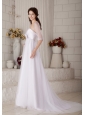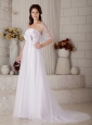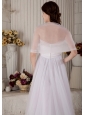 Cast a spell on the whole room by wearing this exquisite pure dress! The fitted, starpless bodice is decorated with a simple bowknot in the middle of the bust which will make you attract more attention. The floor-length skirt flows freely and covered with layers of tulle makes you like a princess! What is more, the see-through tulle made chic jacket can add more charming and grace for you. A sweep train and a zipper up back complete this gorgeous design. Don't hesitate!