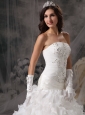 The romantic bride will love this wedding gown. This stunning strapless gown has a straight-across neckline and ornate beading through the gentle ruched bodice. This gown has a drop ruched waist and skirt comprised of layers of soft ruffles for spectacular texture. The skirt is voluminous and ripe with movement for your first dance as a Mrs.