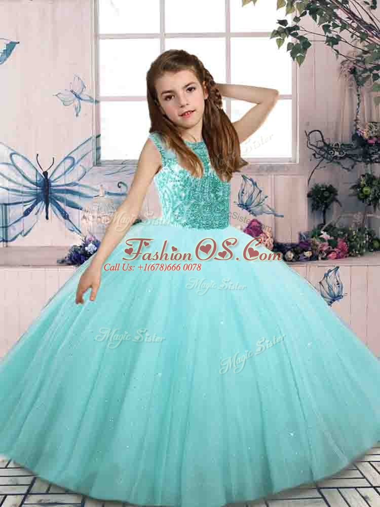 Gorgeous Aqua Blue Ball Gowns Scoop Sleeveless Tulle Floor Length Lace Up Beading Little Girl Pageant Gowns
