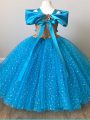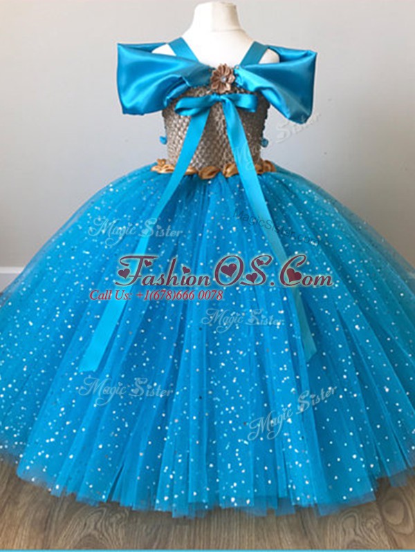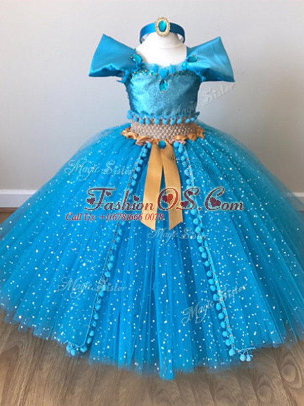 Home >  Special Occasion Dresses >  New Style Little Girl Pageant Dresses > Gorgeous Baby Blue Cap Sleeves Floor Length Sequins and Belt Zipper Pageant Gowns For Girls