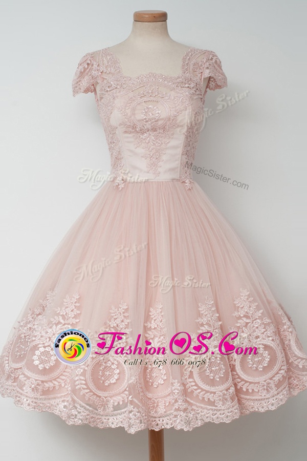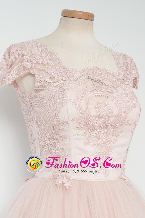 Gorgeous Baby Pink Square Zipper Lace Prom Evening Gown Cap Sleeves