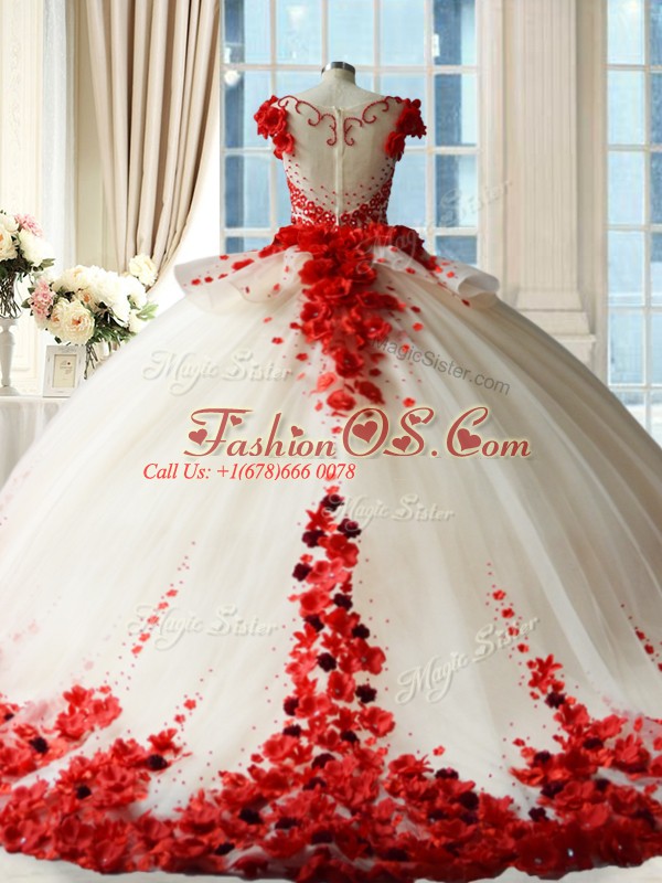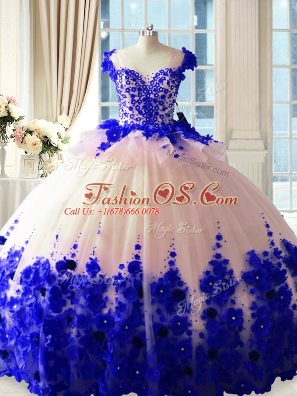 Gorgeous Blue And White Sleeveless Brush Train Hand Made Flower Sweet 16 Dress