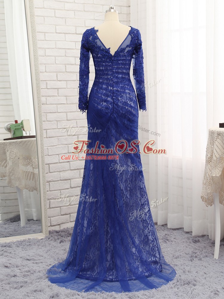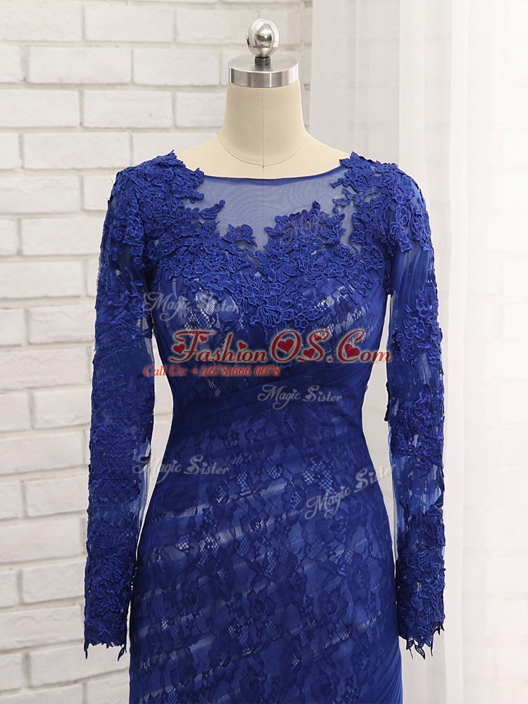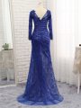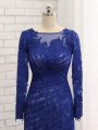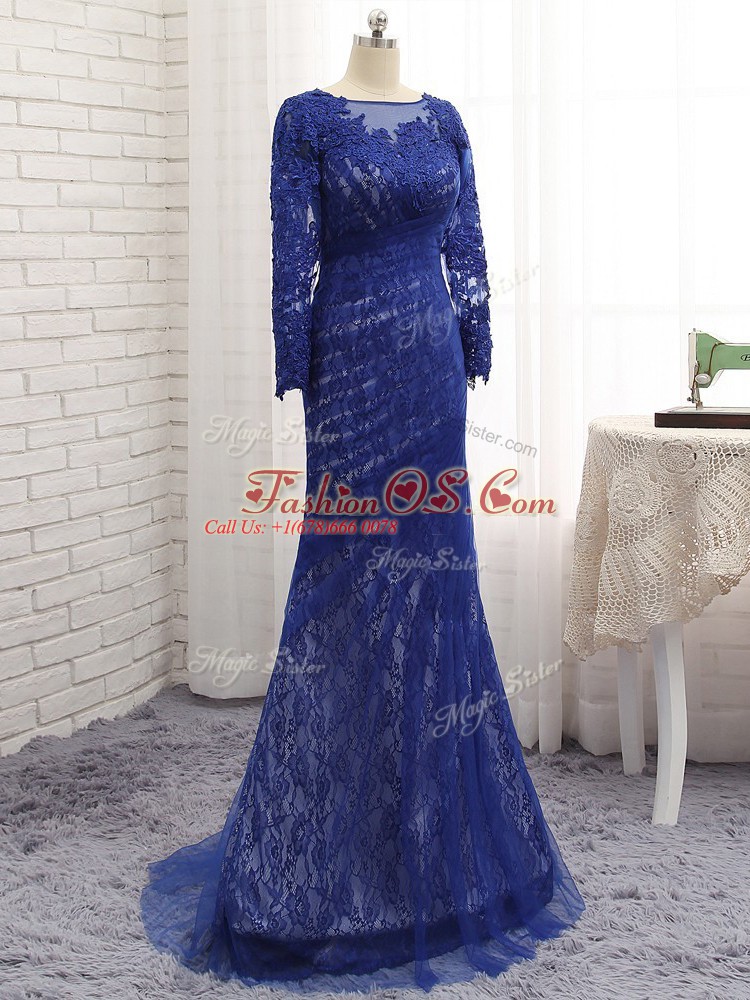 Gorgeous Blue Tulle Zipper Bateau Long Sleeves Mother Of The Bride Dress Brush Train Lace