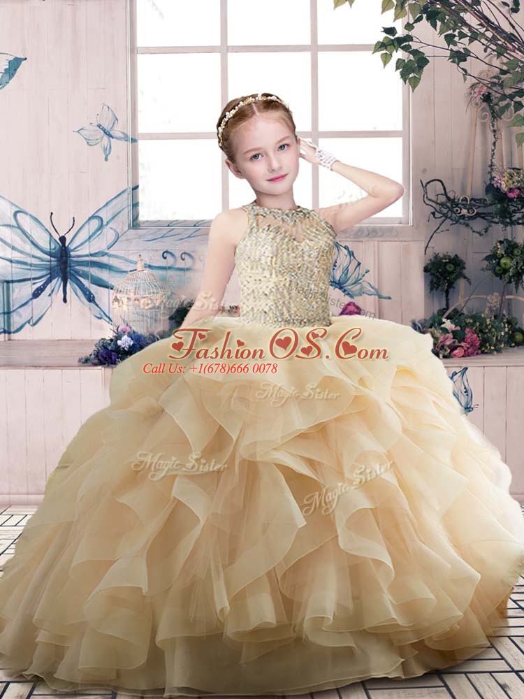 Home >  Special Occasion Dresses >  2019 Little Girl Pageant Dresses > Gorgeous Champagne Ball Gowns Scoop Sleeveless Organza Floor Length Zipper Beading and Ruffles Little Girls Pageant Dress