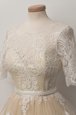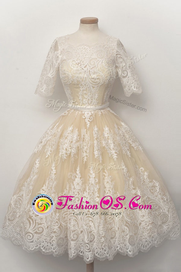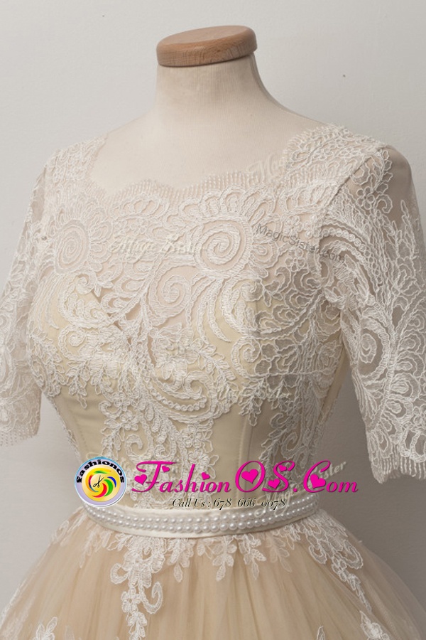 Gorgeous Champagne Tulle Zipper Scalloped Half Sleeves Knee Length Evening Dress Lace and Belt