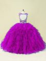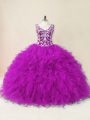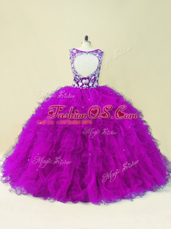 Gorgeous Fuchsia Tulle Backless V-neck Sleeveless Floor Length Vestidos de Quinceanera Beading