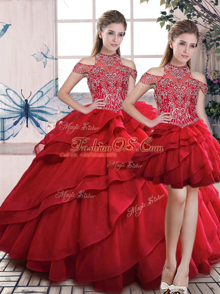 Gorgeous High-neck Sleeveless Organza Vestidos de Quinceanera Beading and Ruffles Lace Up