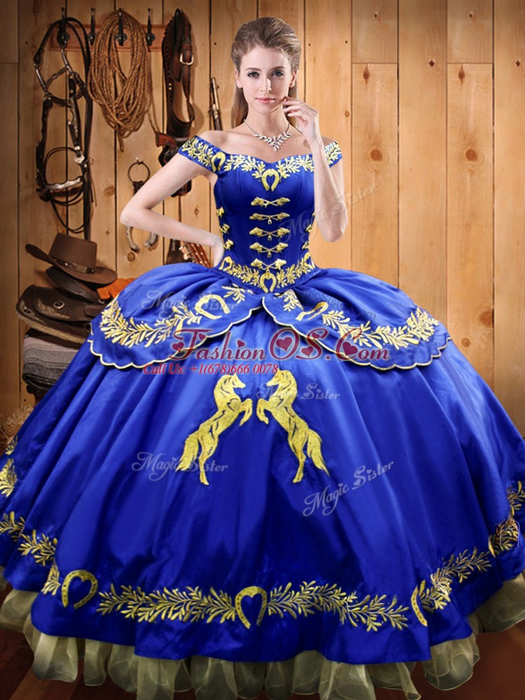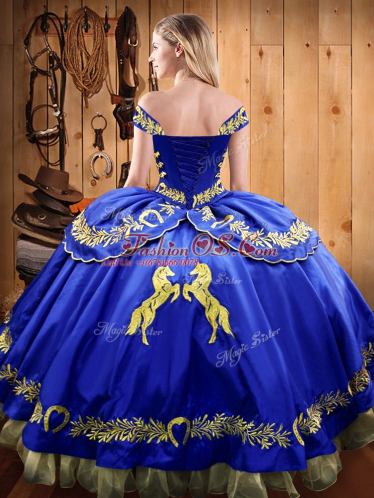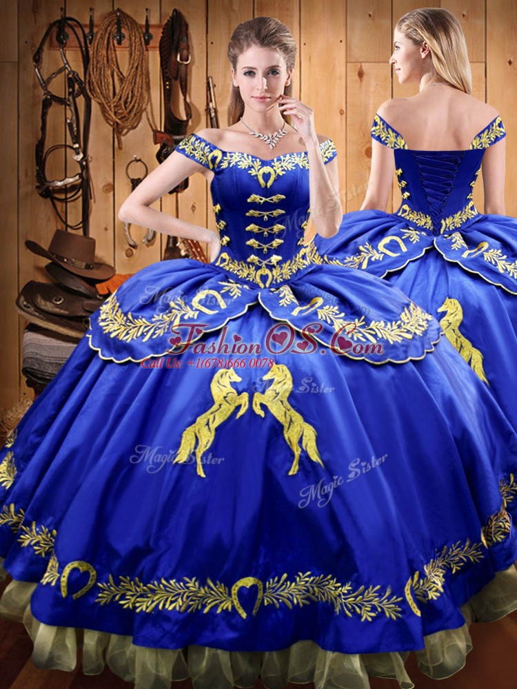 Home >  Quinceanera Dresses >  Best Quinceanera Dresses > Gorgeous Off The Shoulder Sleeveless Quinceanera Dresses Floor Length Beading and Embroidery Royal Blue Satin and Organza