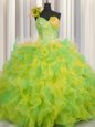 Home >  Quinceanera Dresses >  New Arrival Quinceanera Dresses > Gorgeous One Shoulder Handcrafted Flower Multi-color Lace Up Ball Gown Prom Dress Beading and Ruffles and Hand Made Flower Sleeveless Floor Length