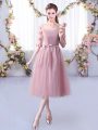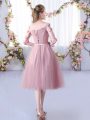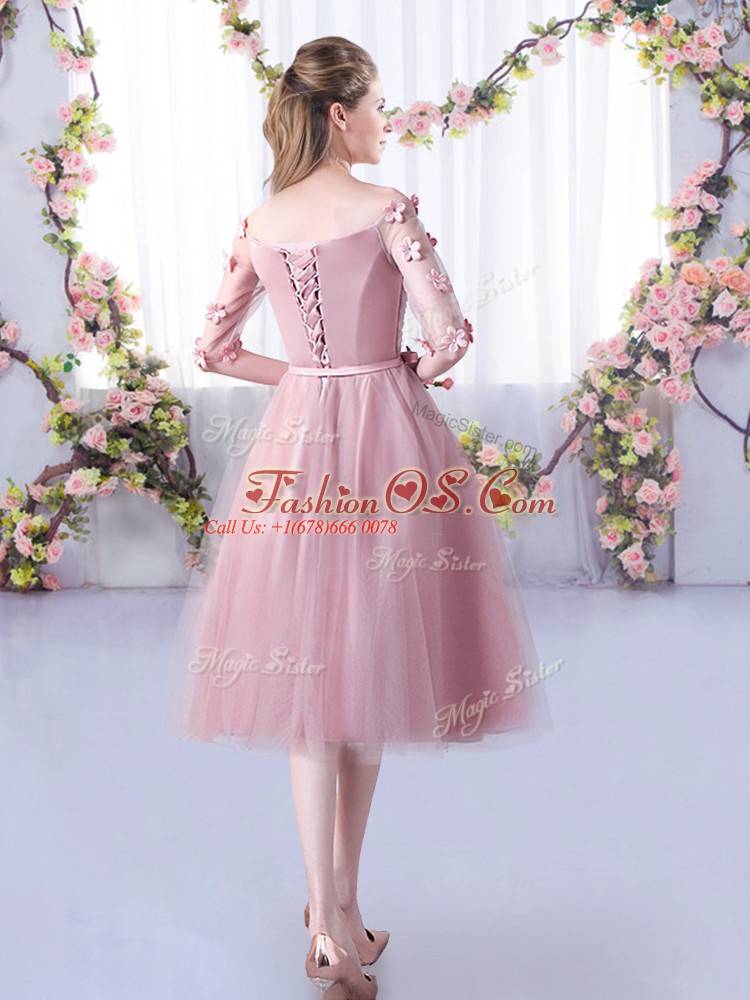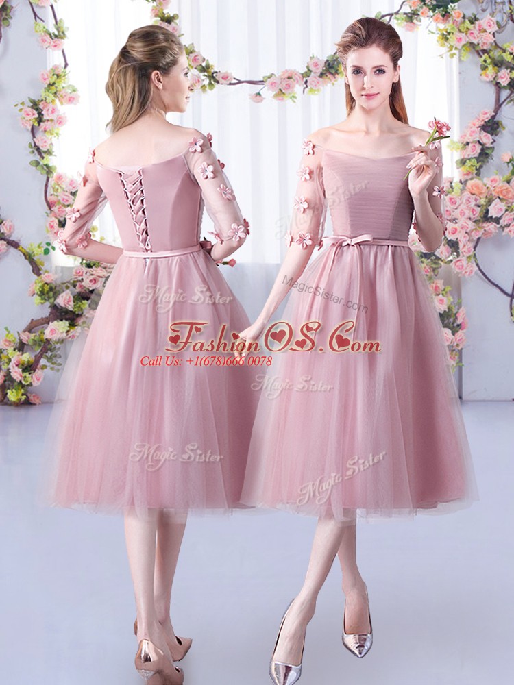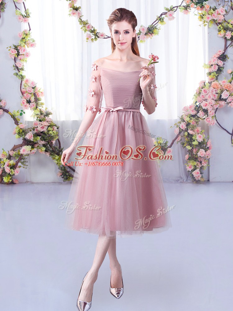 Gorgeous Pink Empire Off The Shoulder Half Sleeves Tulle Tea Length Lace Up Appliques and Belt Quinceanera Court of Honor Dress