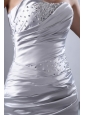If you're looking to make a lasting impression at your upcoming formal event, this stunning dress can make sure that you do. This gorgeous silver mermaid dress features strapless neckline with ruching and beading in the bodice. The back of this charming mermaid dress has a grace lace up closure and the skirt is complete to an elegent brush train.