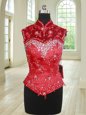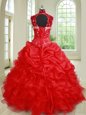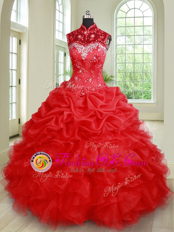Gorgeous Three Piece Red High-neck Neckline Beading and Ruffles and Pick Ups Quinceanera Gowns Sleeveless Lace Up