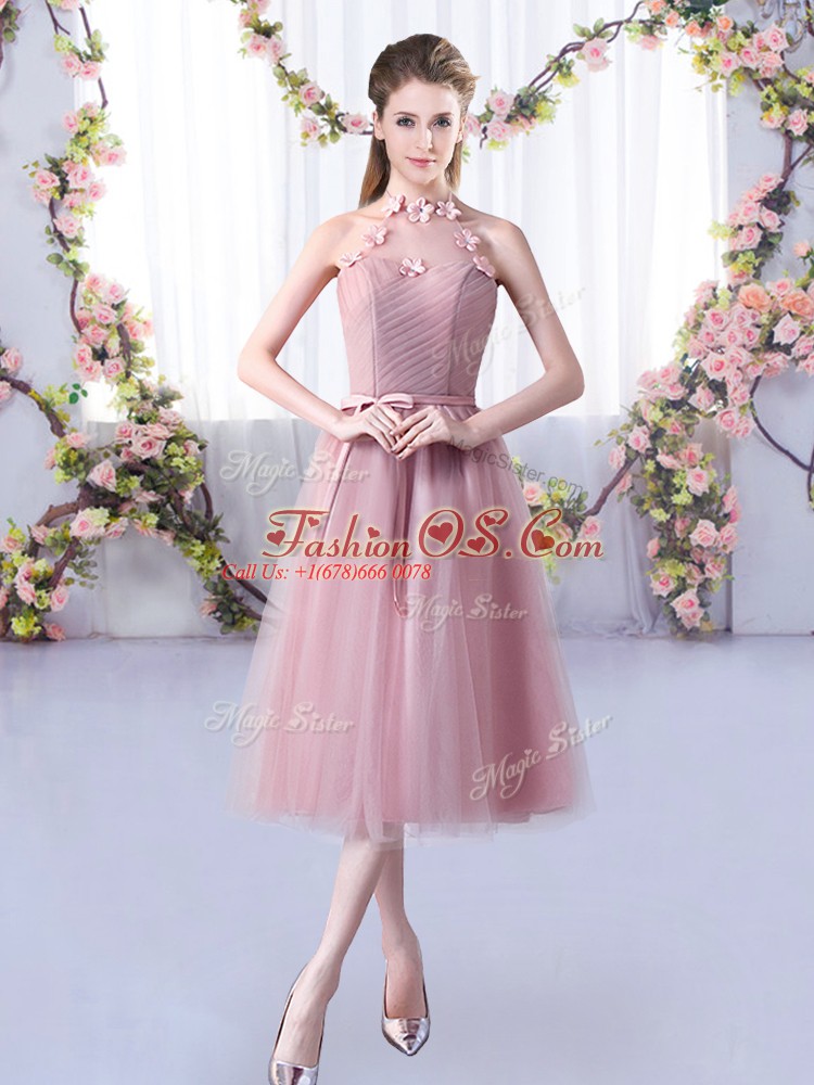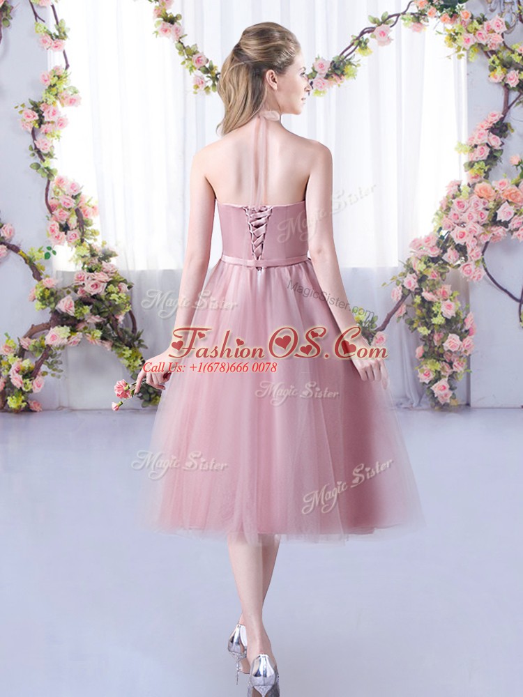 Gorgeous Tulle Halter Top Sleeveless Lace Up Appliques and Belt Vestidos de Damas in Pink