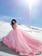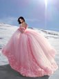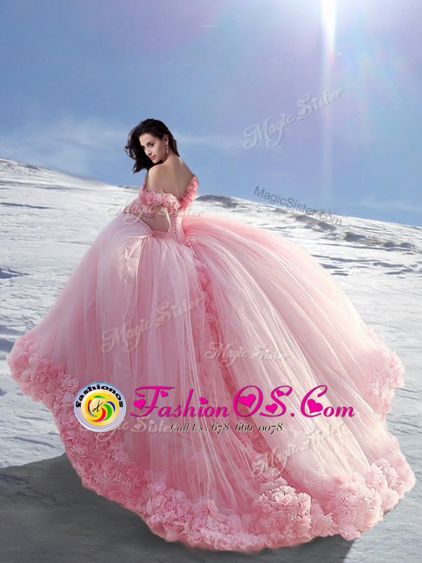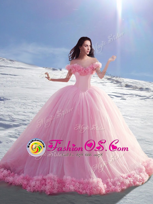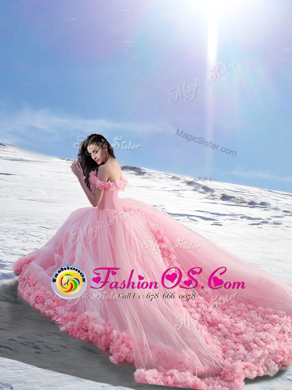 Gorgeous Tulle Off The Shoulder Cap Sleeves Court Train Lace Up Hand Made Flower Sweet 16 Quinceanera Dress in Rose Pink