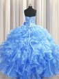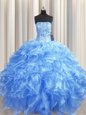 Gorgeous Visible Boning Baby Blue Organza Lace Up Quinceanera Gowns Sleeveless Floor Length Beading and Ruffles