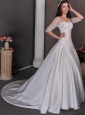 This one will put you to mind of a traditional southern belle, when you put on this white wedding dress! It is highlighted with a straight neckline and half sleeves wraping the shoulder on the bodice with beaded appliques for accent. The A-line skirt with pleating has a court train adorned with a bunch of flower that cascades to the floor. A lace up corset style closure in the back secures the dress in place.