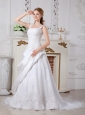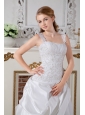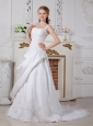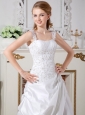 Fantastic is the word created for this wedding gown. It has a pleated strapless neckline. Beaded appliques adorned throughout the bodice as well as on the wide straps. A delicate trim is cut to create a wonderful fit from bodice to hip. Similar exquisite appliques scatter at the hemline reveal your elegance. A lace up back makes the dress well fitted.