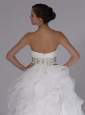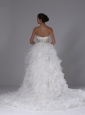 This dramatic wedding dress featured with its A-line silhouette and the embroidery bodice has an air of mystery about it. Flower-shaped ruffles on the romantic skirt make the beauty of the dress vivid. A Sweep train add the fantastic look. Corset closure can outline your slim figure especially your charming waist. Simple but fashion design is suitable at wedding.