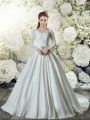 Gorgeous White A-line V-neck Long Sleeves Taffeta Chapel Train Lace Up Lace and Belt Wedding Gown